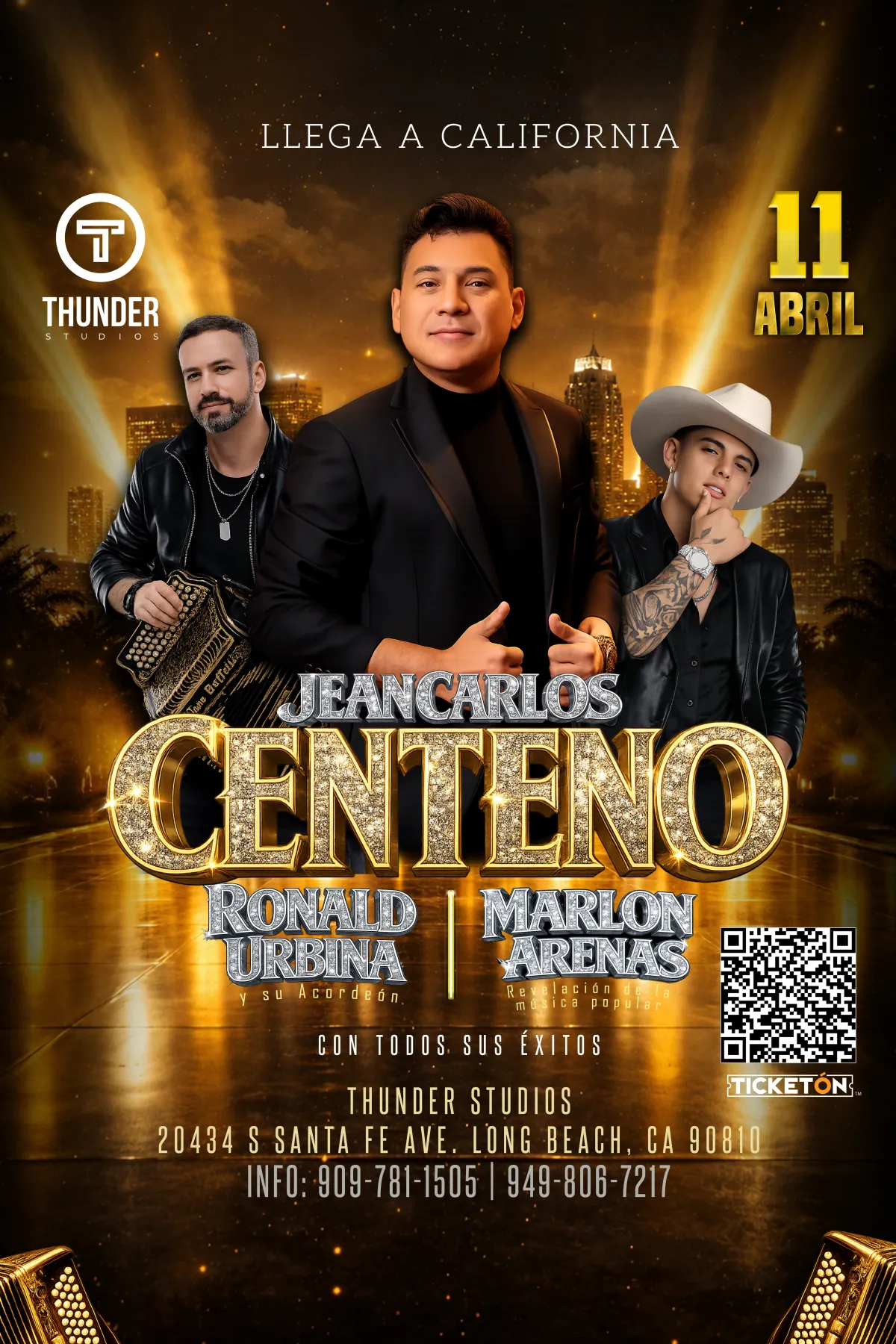 tDescubre la vibrante música tropical de Jean Carlos Centeno en un evento en vivo imperdible en el Thunder Studios de Long Beach, CA. Deja que la adrenalina del escenario y la euforia desbordante del público te embriaguen en esta espectacular noche para recordar. Compra ya tus boletos para sentir de cerca la energía y emoción de este show el próximo 11 de abril de 2026. Este concierto promete ser una explosión de ritmos tropicales que te harán vibrar hasta el amanecer. No puedes perderte esta única oportunidad de vivir la mejor experiencia musical. ¿Listo para una velada inolvidable? Asegura tu lugar antes de que se agoten los boletos. Este evento es exclusivo para mayores de 21 años, así que prepárate para disfrutar sin restricciones. Consigue ya tu boleto de acceso en Ticketón y vive una noche increíble con el famoso Jean Carlos Centeno. ¡No puedes quedarte fuera!